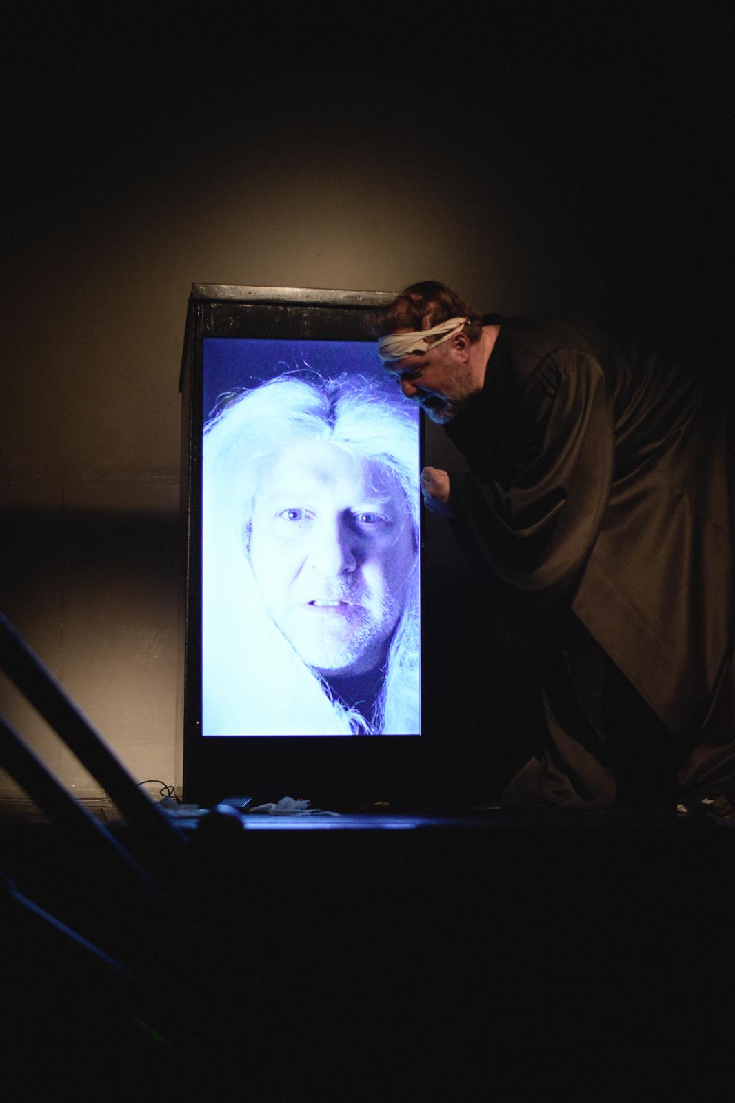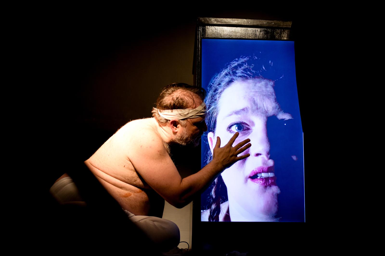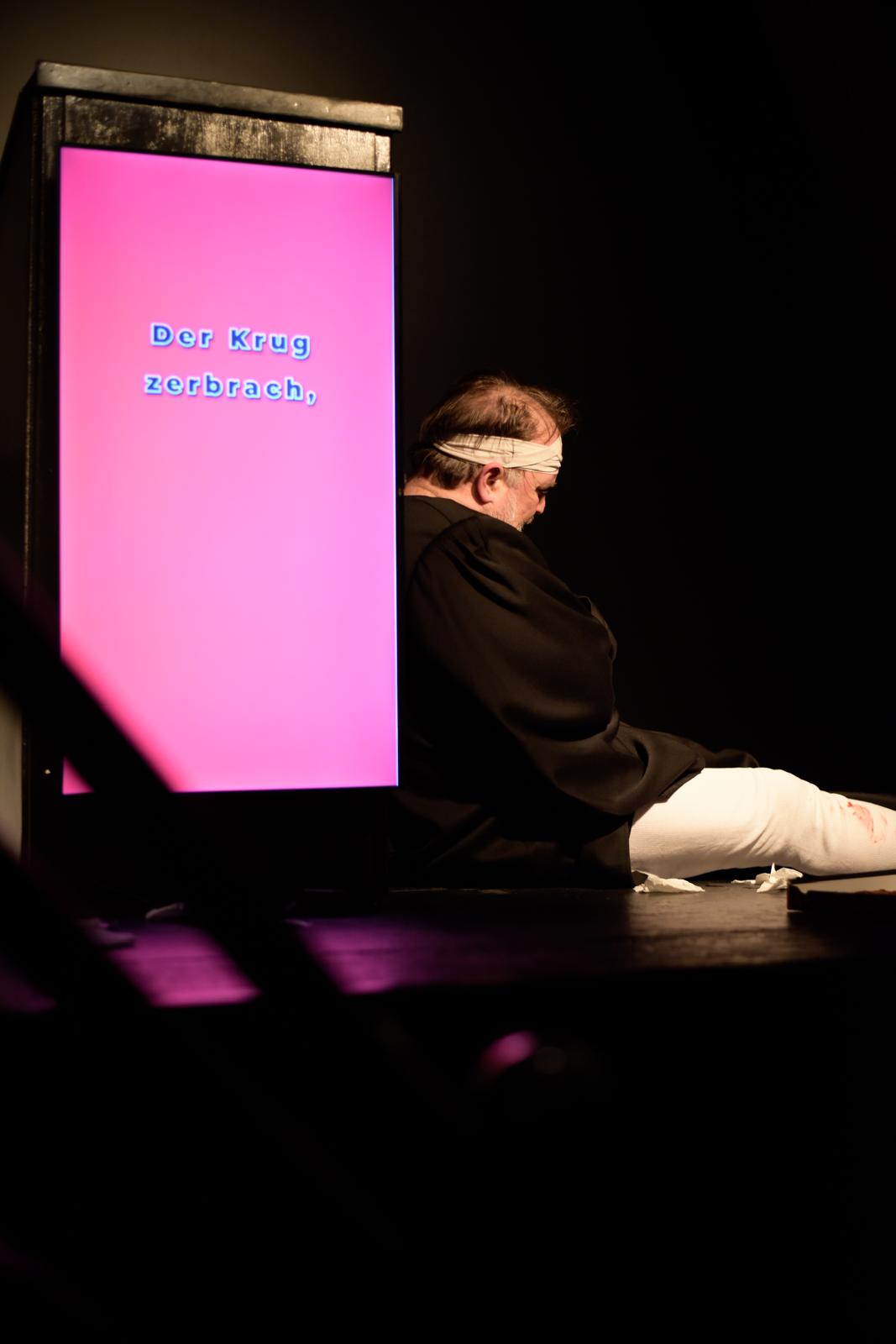 Vor ihm ein Rednerpult, darin ein hochkant stehender Fernseher. In diesem Bildschirm tauchen die Figuren aus Kleists „Der zerbrochne Krug“ auf: Marthe, Ruprecht, Brigitte, Walter – und vor allem Eve. Adam steht live auf der Bühne, die anderen existieren als flackernde Erinnerungsbilder, Echos einer Nacht, die er bis heute nicht wirklich begreift.