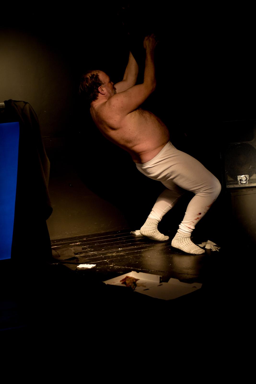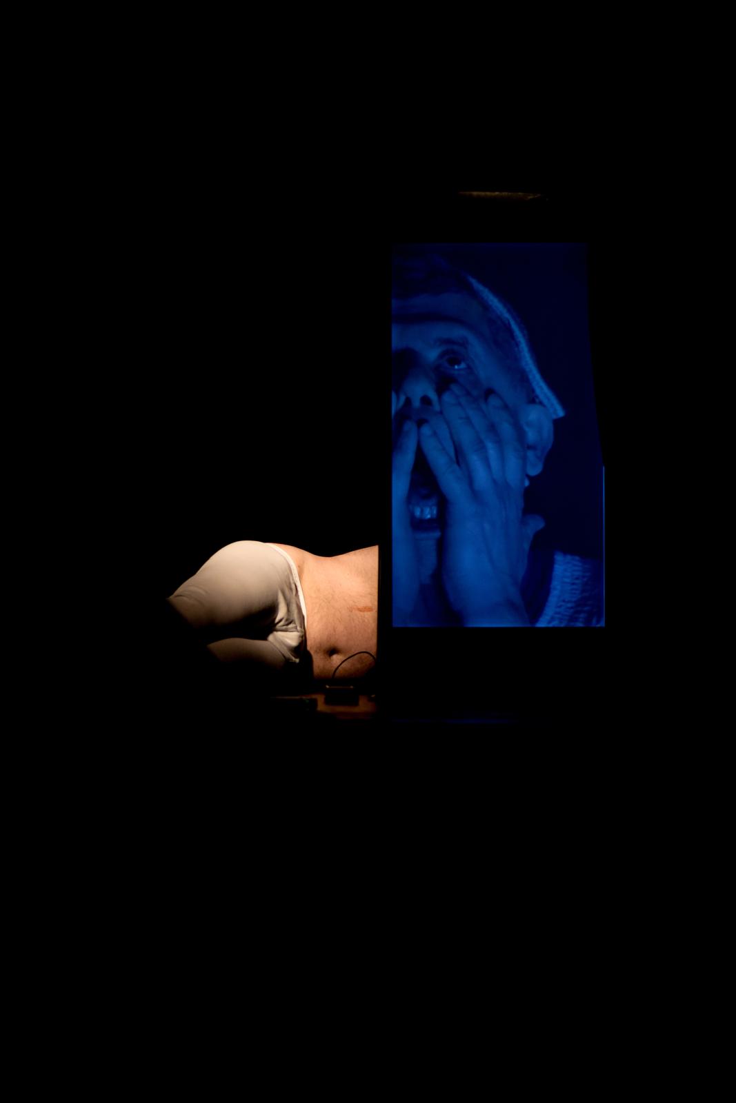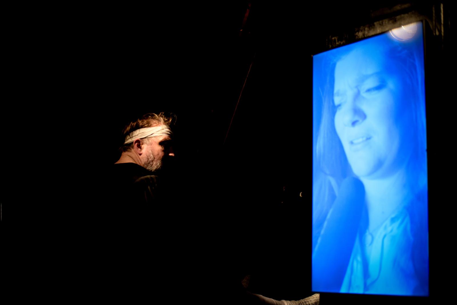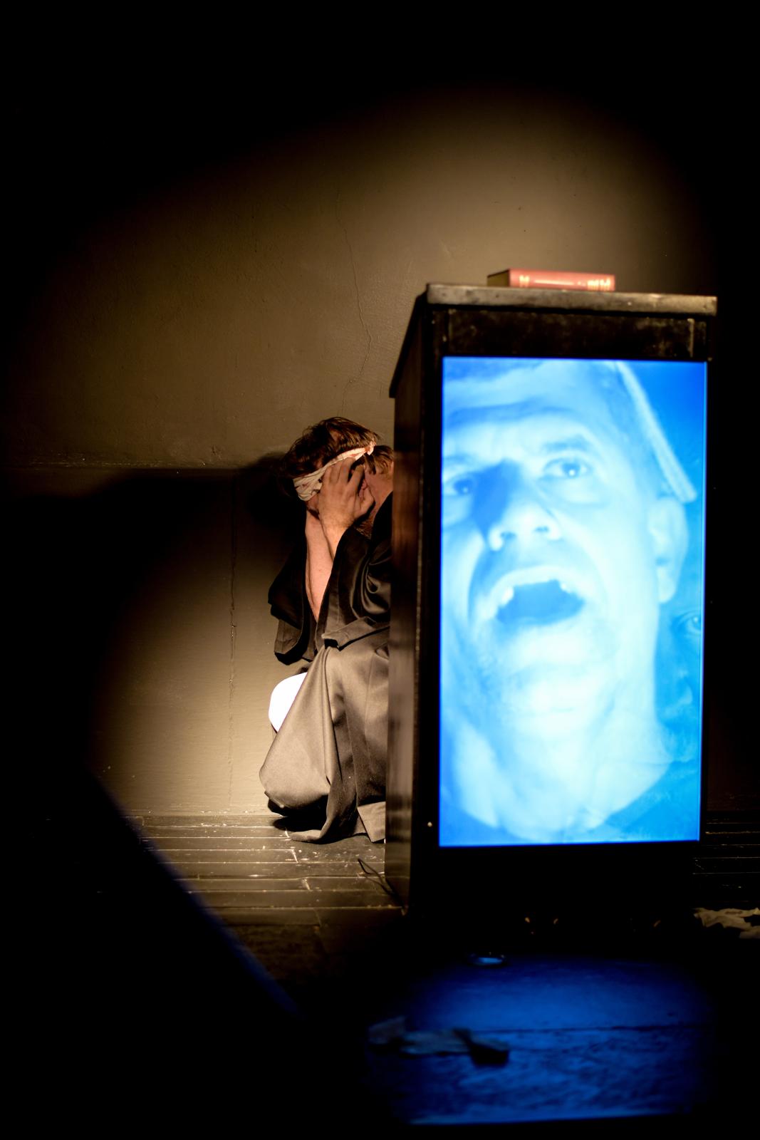 Vor ihm ein Rednerpult, darin ein hochkant stehender Fernseher. In diesem Bildschirm tauchen die Figuren aus Kleists „Der zerbrochne Krug“ auf: Marthe, Ruprecht, Brigitte, Walter – und vor allem Eve. Adam steht live auf der Bühne, die anderen existieren als flackernde Erinnerungsbilder, Echos einer Nacht, die er bis heute nicht wirklich begreift.